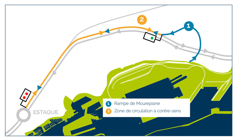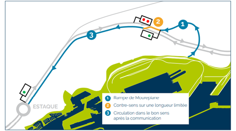 Dès fin 2025 et la fermeture de la gare du Canet, les trains de fret sortant du port remonteront le raccordement de Mourepiane, avant d'emprunter la voie ferrée existante à contre-sens jusqu'à la gare de l'Estaque, où ils rejoindront une voie ferrée dans le bon sens de circulation. En sortie du raccordement de Mourepiane, sera implanté un signal autorisant l'entrée des trains fret sur la voie ferroviaire à contre-sens (cf. schéma ci-dessous). Le temps d'insertion maximal nécessaire sera alors de 13 minutes, les trains fret n'impacteront donc pas la circulation des trains voyageurs dont le cadencement en heure de pointe est actuellement à la demi-heure.