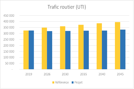 Le report modal vers le fer induit par le projet permettra peut-être de limiter la croissance du trafic routier, si et seulement si les opérateurs de transport combiné veulent y adhérer. Dans le cas contraire, le trafic routier ne fera que croître. Si l'on ne contraint pas les opérateurs à utiliser le rail comme mode de transport sur les longues distances, l'ambition de passer d'une part modale de 9% pour le fret ferroviaire en 2019 à 18% en 2030 et jusqu'à 25% à l'horizon 2050 risque de ne pas être atteinte. Dans tous les cas de figure, comme le montre le graphique, il n'y aura pas de baisse significative du trafic routier, à minima il n'y aura qu'une stagnation de ce trafic.
